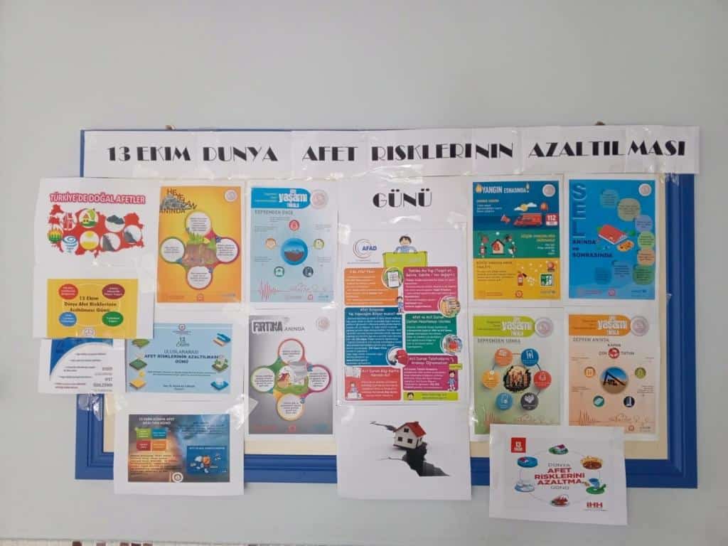 Afet Azaltma Günü Etkinlikleri kapsamında okulumuzda Yangın, Deprem ve Tahliye tatbikatları yapılmıştır. Afetler konusunda program, videolar ve pano çalışmaları ile bilinçlendirme çalışmaları yapılmıştır. Emeği geçen öğretmenlerimize ve öğrencilerimize teşekkür ederiz.